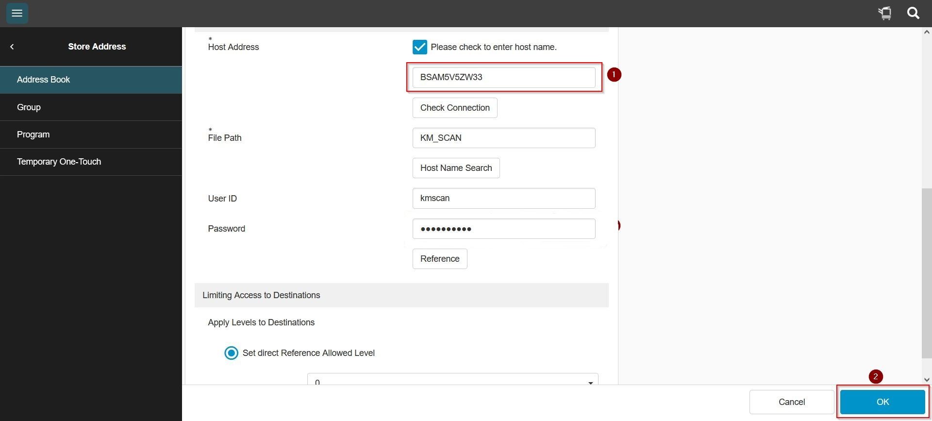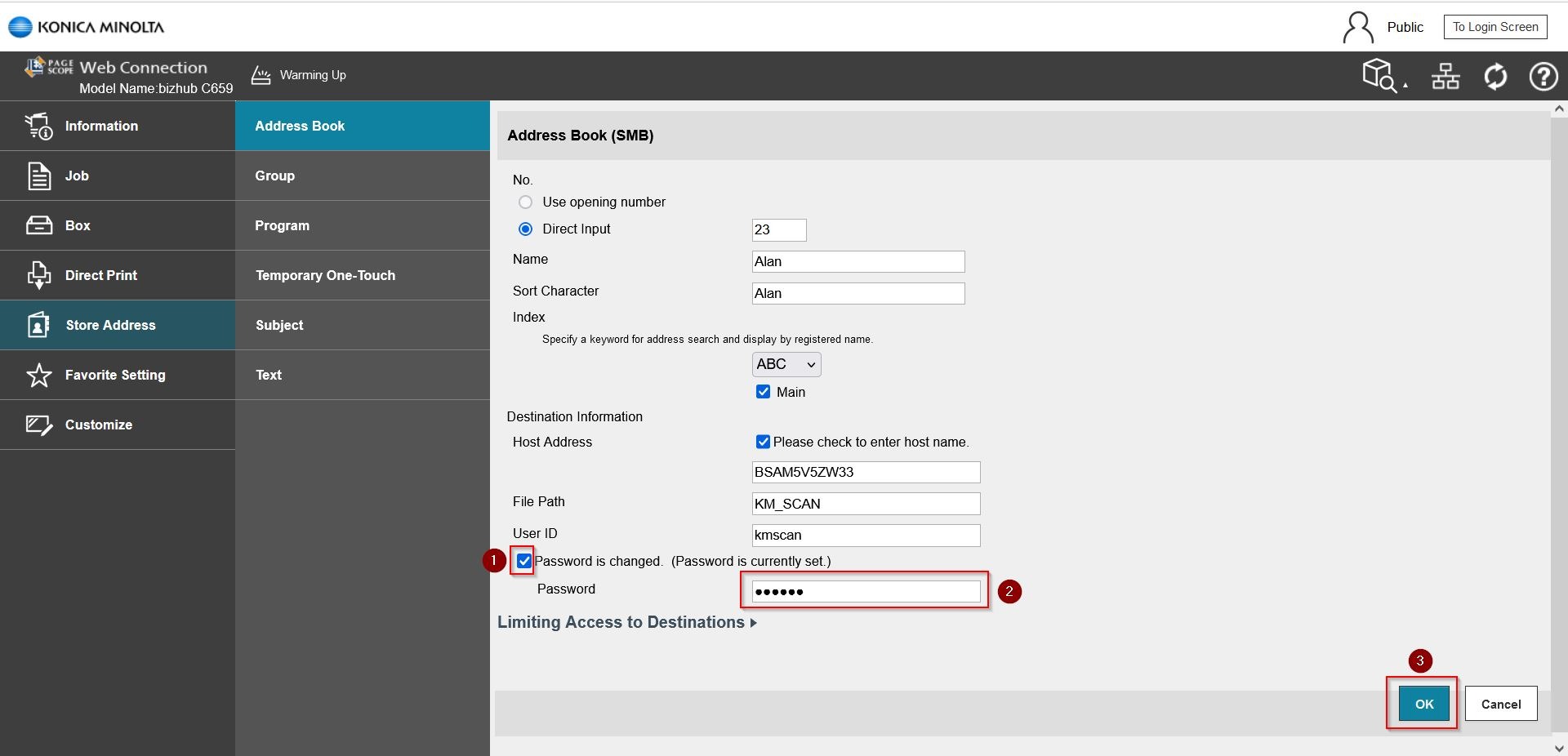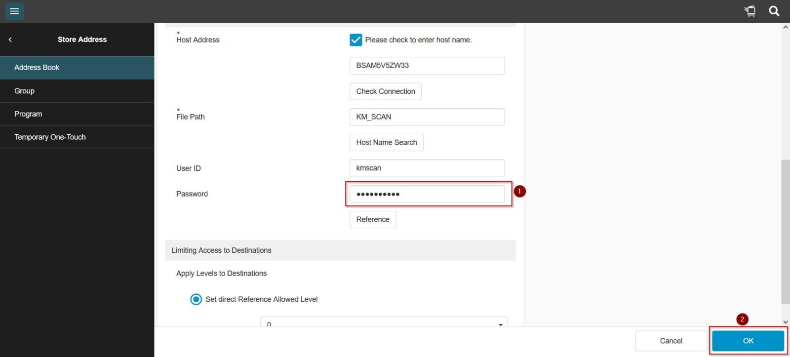 STEP 4 – Scroll down and tick password not expired, then proceed to type in the password that has been set on step 2, key in password kmscan if it is (a) and password Minolta.123 if it is (b). Click [OK] to save the setting.