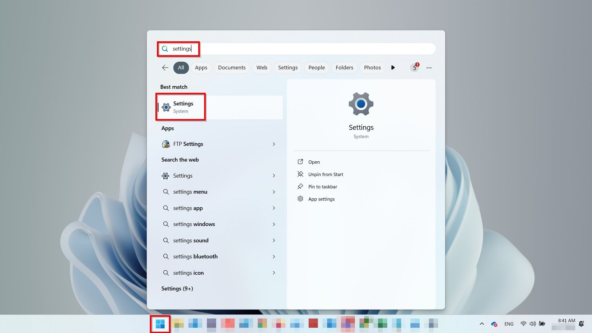 STEP 1 – Click on the windows [Start] button, type [settings] and select [Settings].