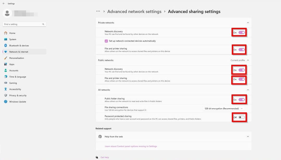STEP 4 – Expand [Private Networks], [Public Networks], [All Networks] ensure the following setting is [Turn On] and the password protected sharing is [Turn Off].