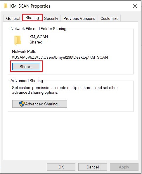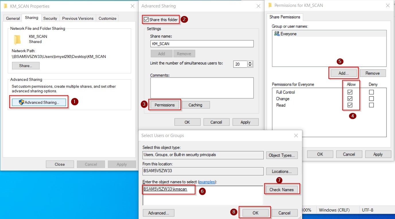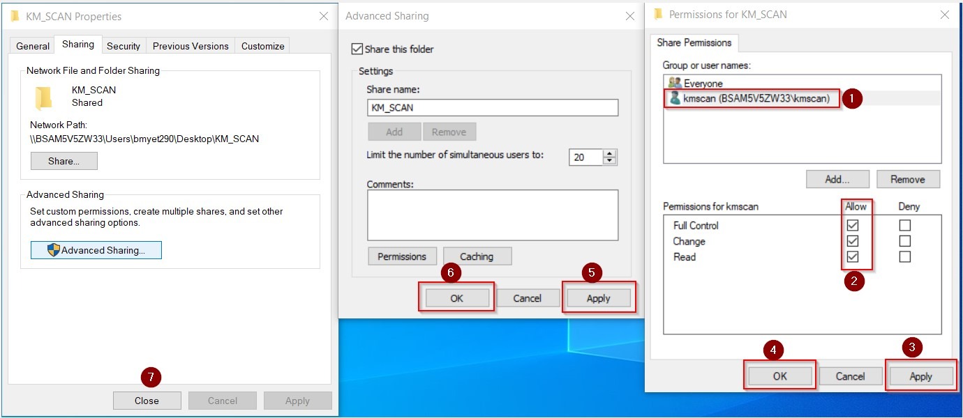 STEP 8 – Highlight the kmscan user account and set permission to [Full Control]. Click [Apply] – [OK] twice to save the settings.