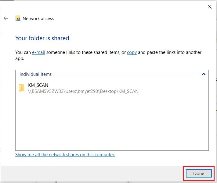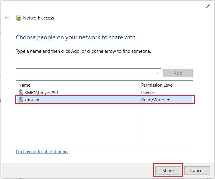 STEP 3 – Make sure the scan user account [kmscan] is added and the permission level selected [Read/Write] then proceed to click [share] – [done].