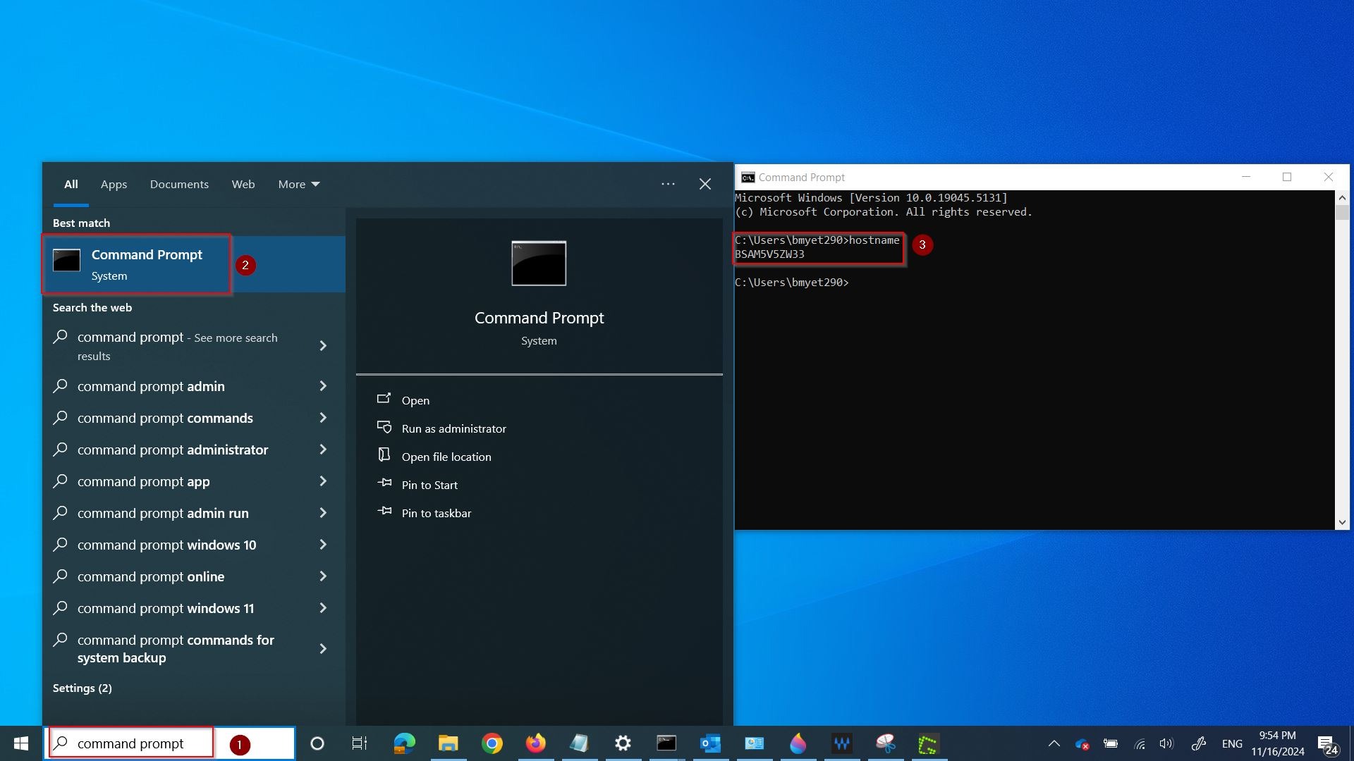 STEP 2 – Type the command hostname inside Command Prompt and press [Enter]. It will show the computer name, kindly take note on this and will need to be use later on next step.