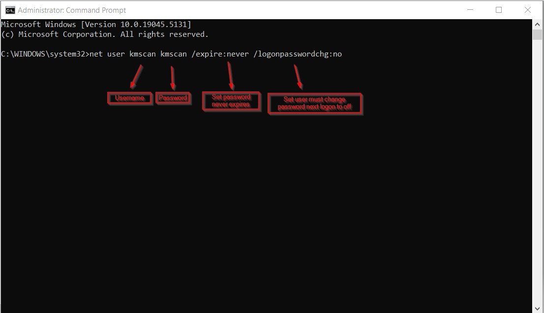 a) net user kmscan kmscan /expire:never /logonpasswordchg:no