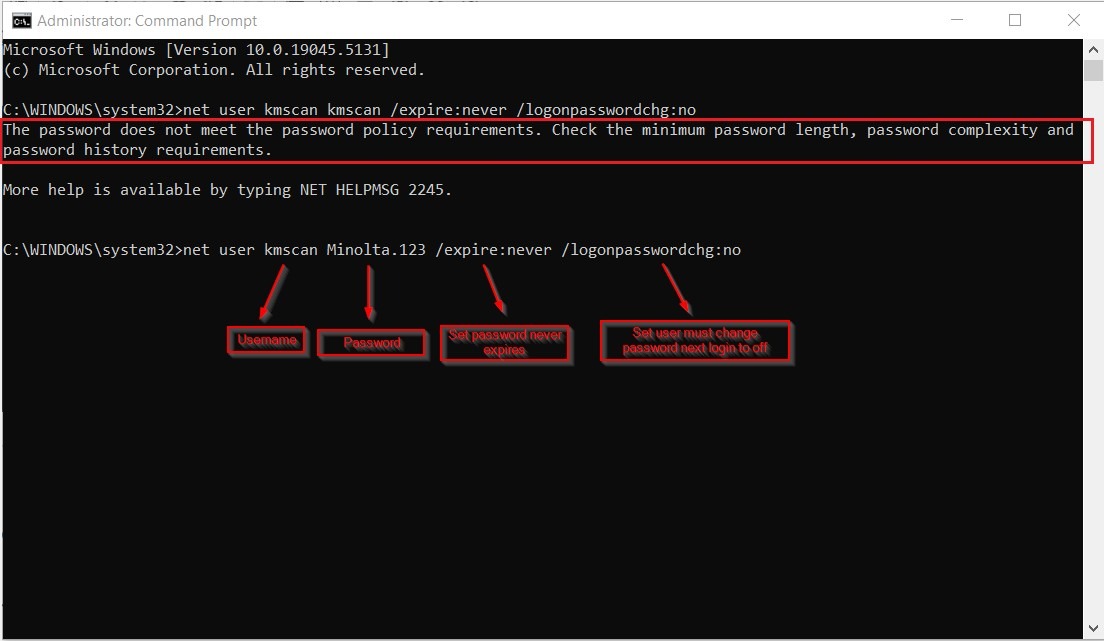 b) net user kmscan Minolta.123 /expire:never /logonpasswordchg:no