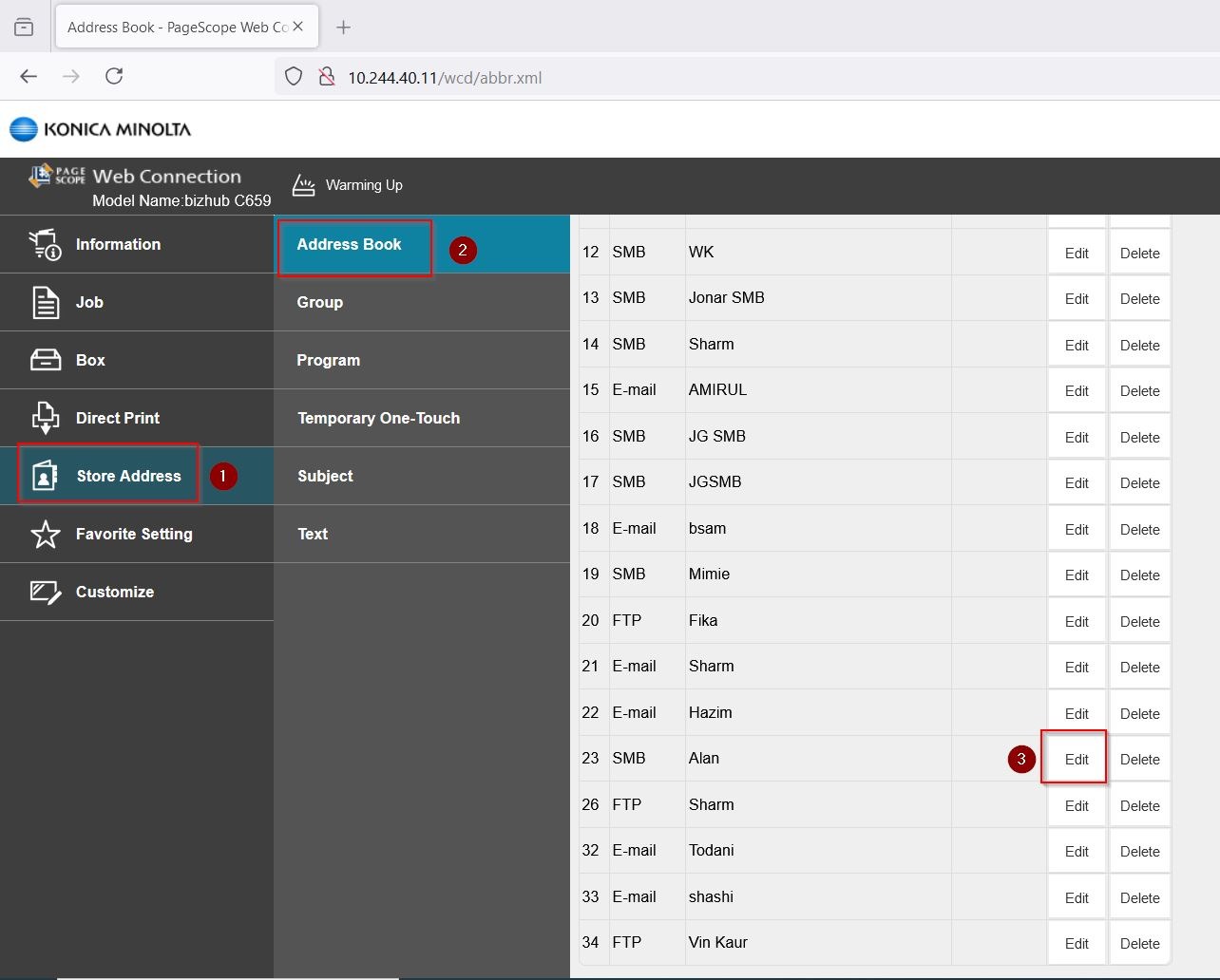 STEP 3 – Go to any web browser and type in Machine IP Address to access Web Connection. You may refer here on how to access Web Connection. Then proceed to [Store Address] – [Address Book].