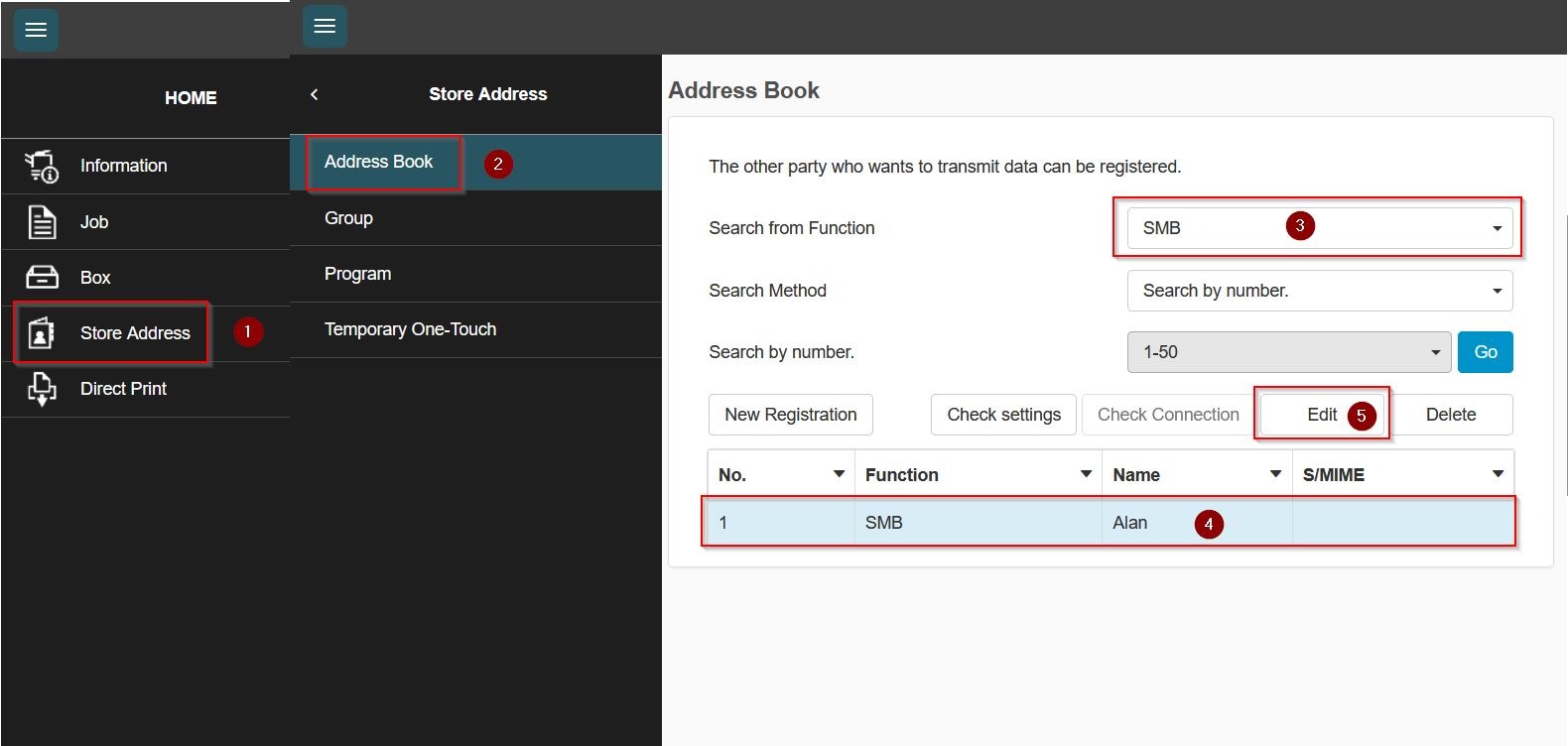 For I Series Machine, change the [Email] -> [SMB], highlight the name that can’t scan, then select [Edit] and proceed to next step.