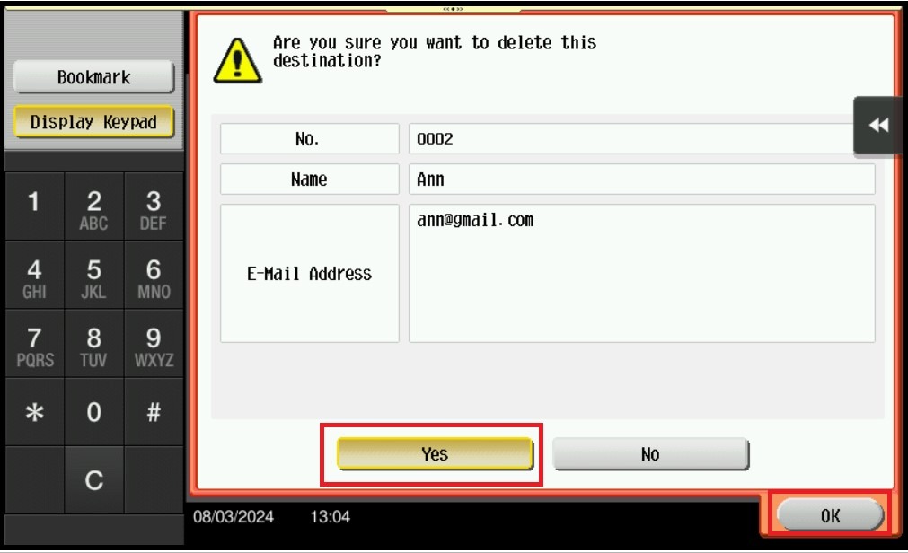 STEP 7 – Select [Yes] – [OK] to delete this email address on address book machine.