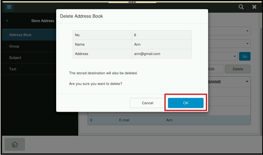 STEP 4 – Select [OK] to delete this email address on address book machine.