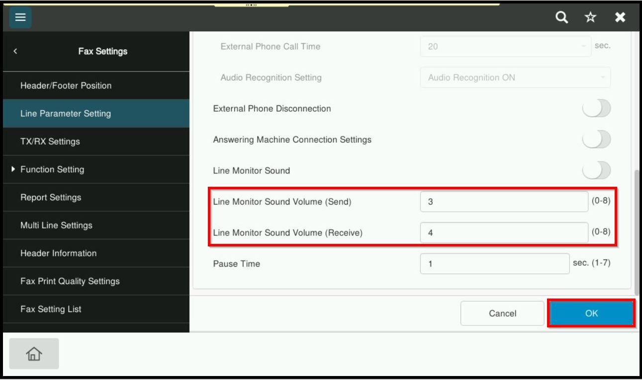 STEP 6 – Select [Line Monitor Sound Volume (Send)] and [Line Monitor Sound Volume (Receive)]. Key in the number in between (Lower 0 – 8 Higher) to adjust the fax volume. After that click [OK] to save.