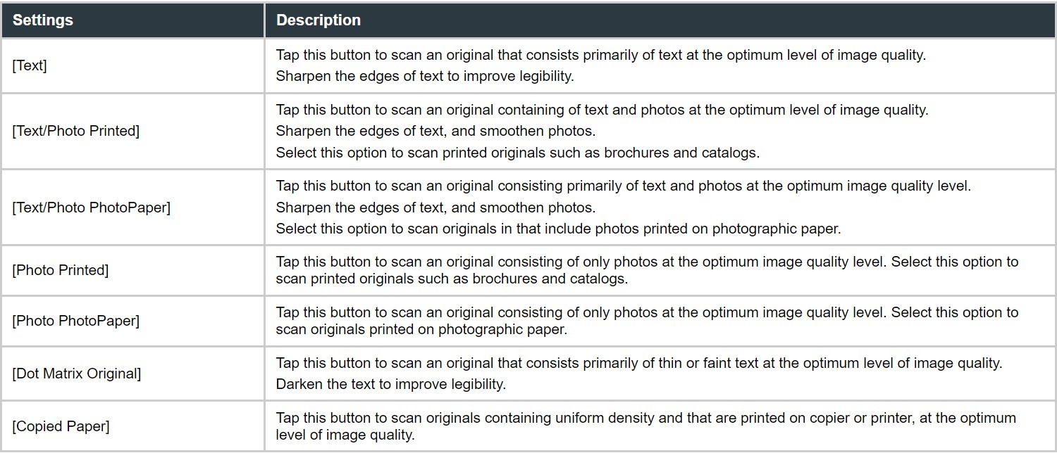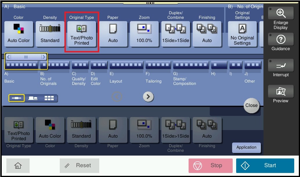 Guide on how to change the original type to dot matrix or photo paper for copy.