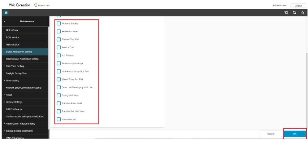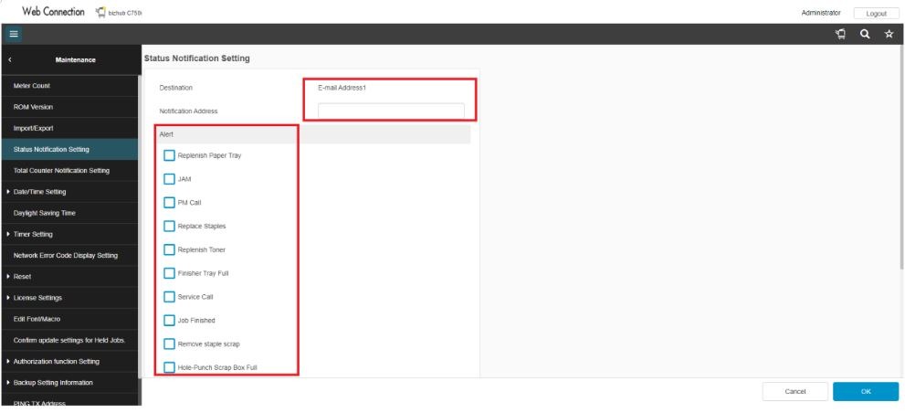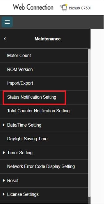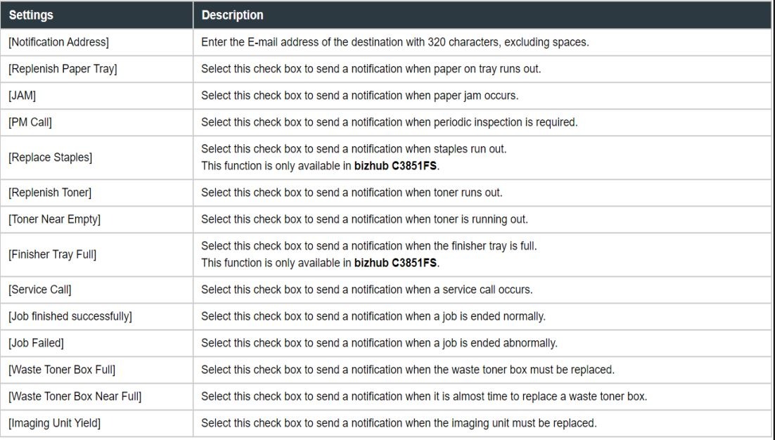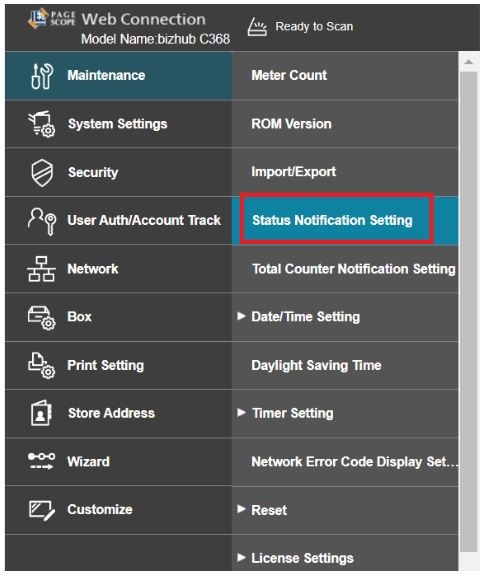 This setting is to register destination E-mail addresses on machine to receive a notification when the error code machine occurs. Before setup the status notification settings, the machine need to be setup scan to email in order to able to receive alert via email, click here on how to setup scan to email on machine.