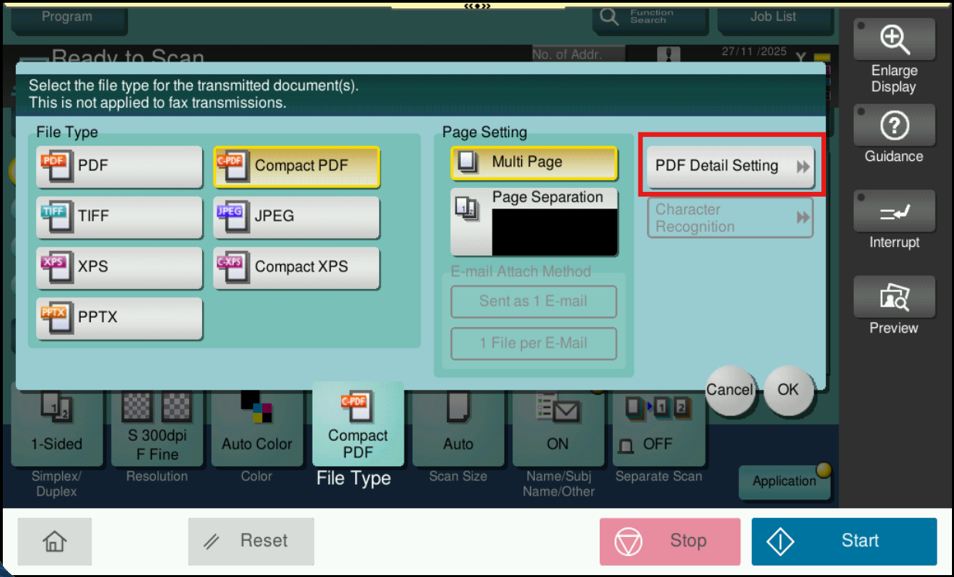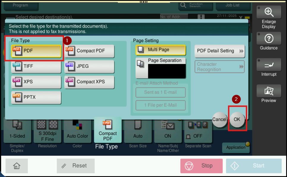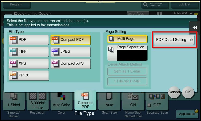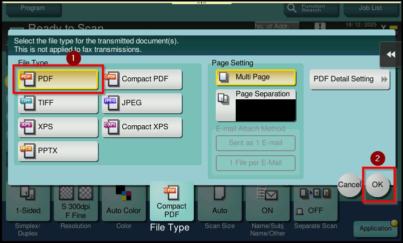 STEP 4 – Ensure that the [File Type] is set to PDF, then click [OK] to save the setting. After that, continue with the scanning process as usual.