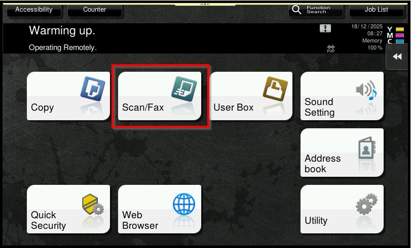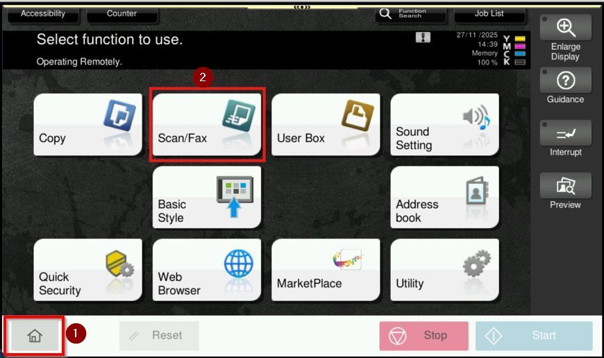 STEP 1 – On the Konica Minolta machine control panel, click on the [Home] button then select [Scan].