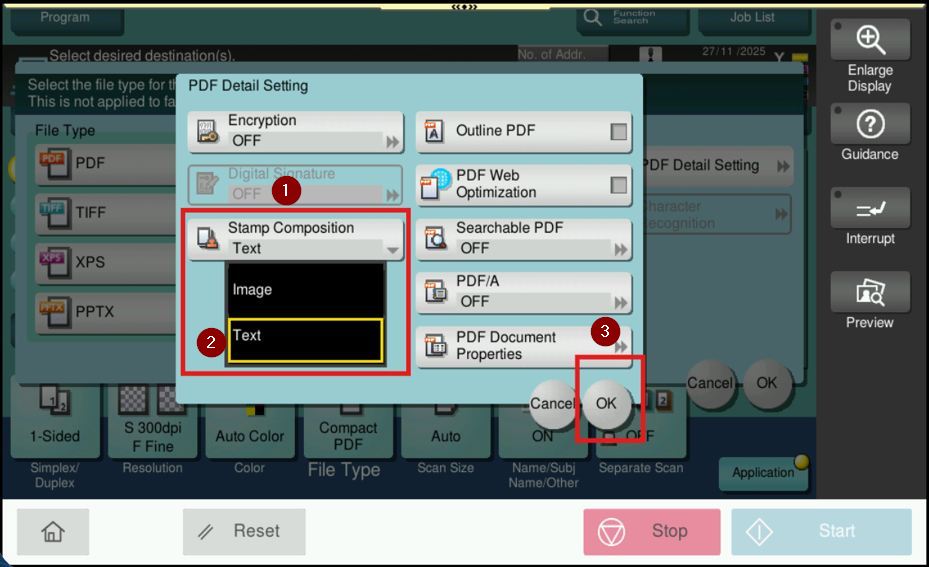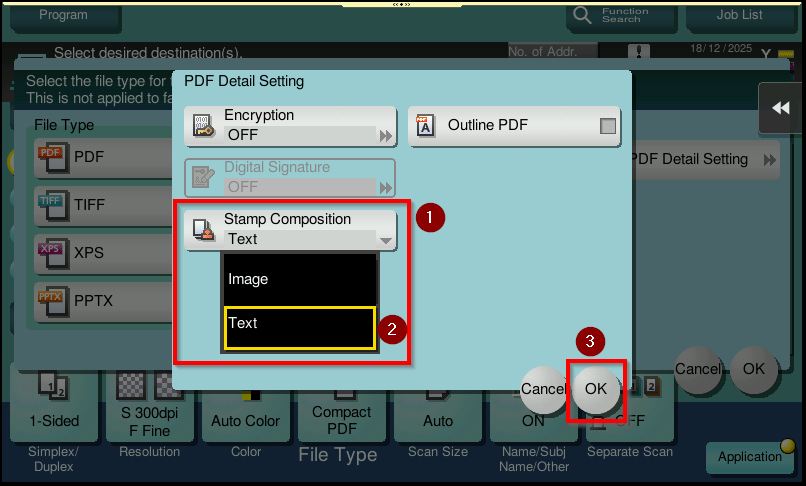 STEP 3 – Select [PDF Detail Setting] – [Stamp Composition], change from [Image] to [Text], and then click [OK].