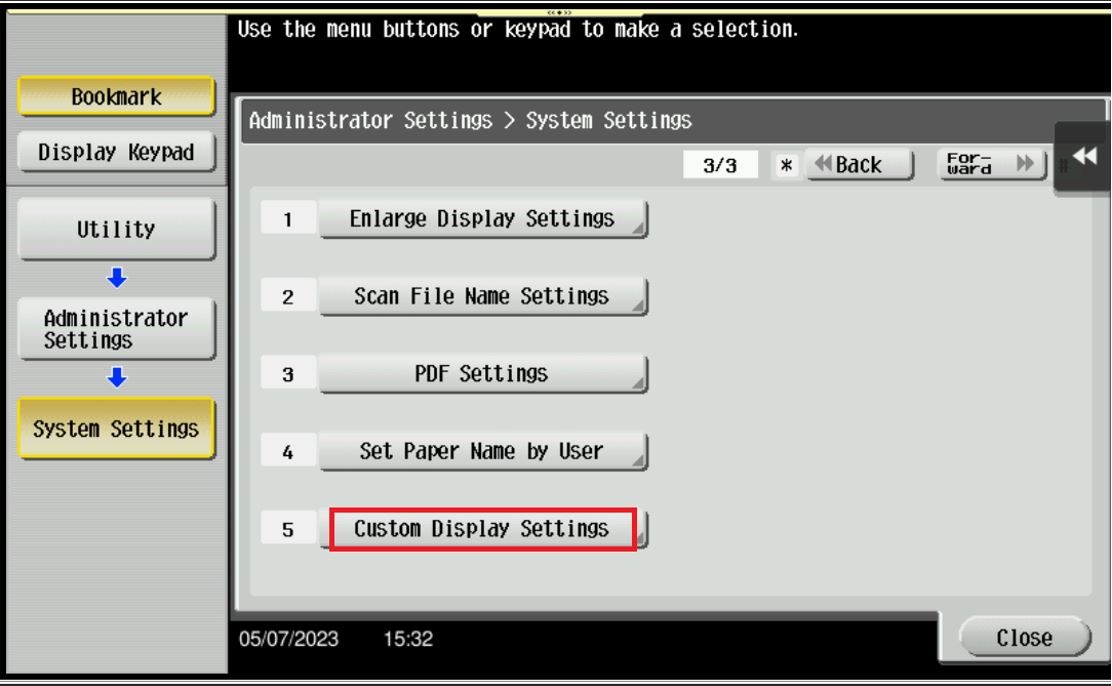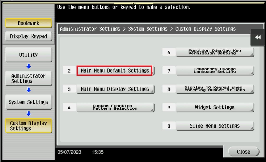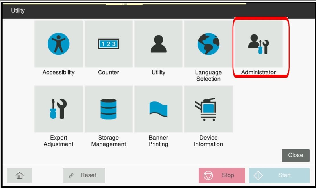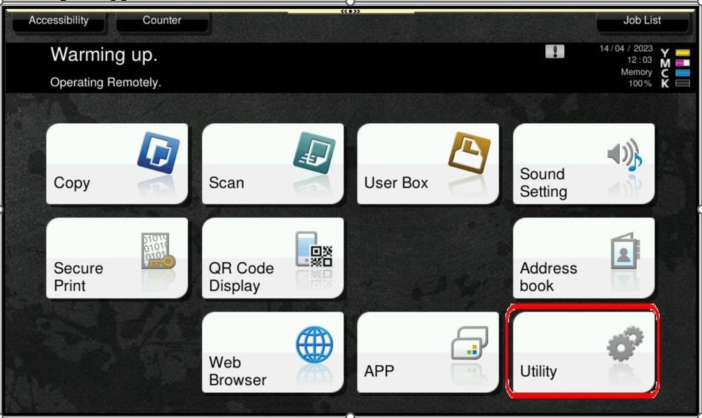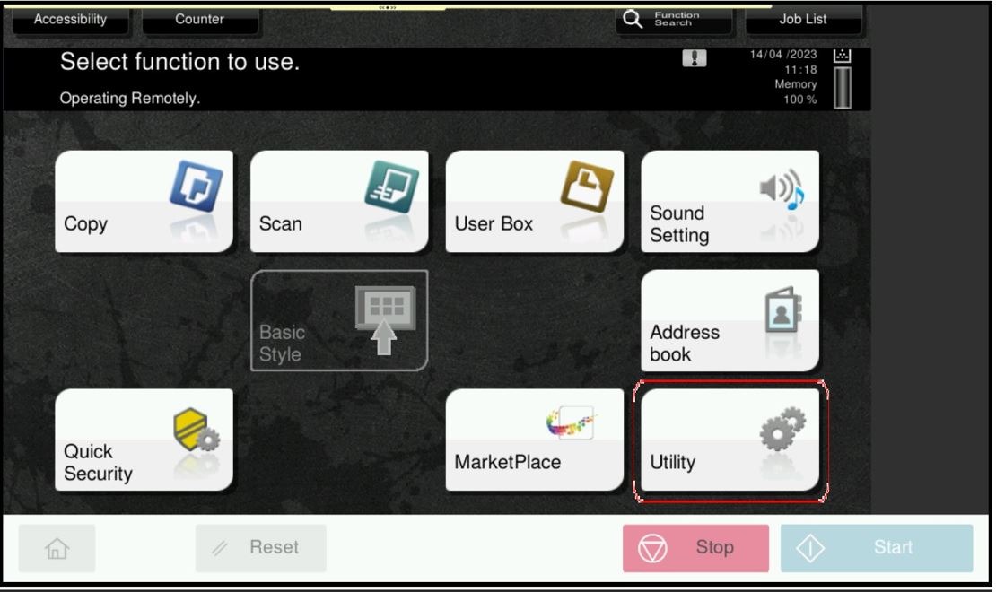STEP 1 – On the Konica Minolta machine, we need to customizing the Main Menu on the main screen, Select [Utility].