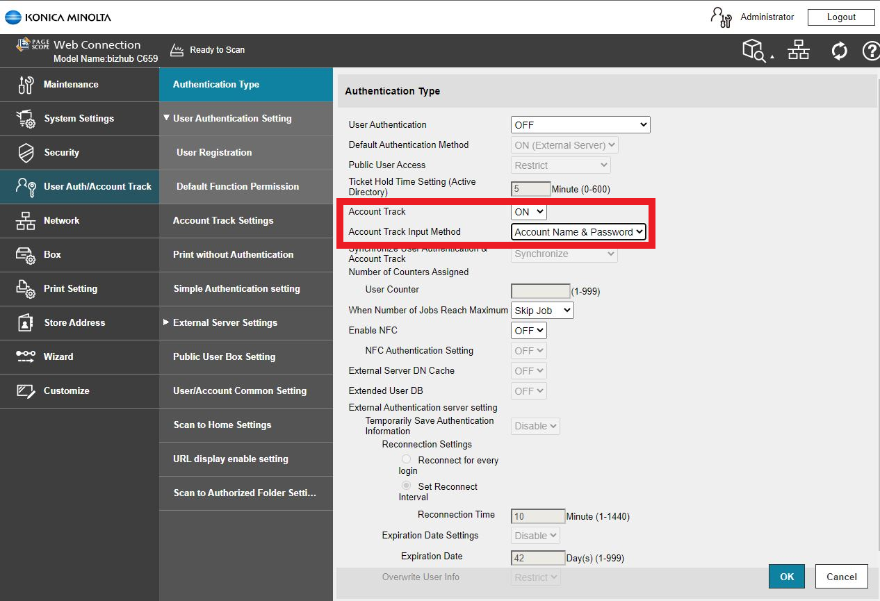 STEP 3: Logout from public then login as Administrator and go to [User Auth/Account Track] > [Authentication Method] > Turn ON Account Track and set the Account Track Input Method to [Account Name & Password] or [Password only].