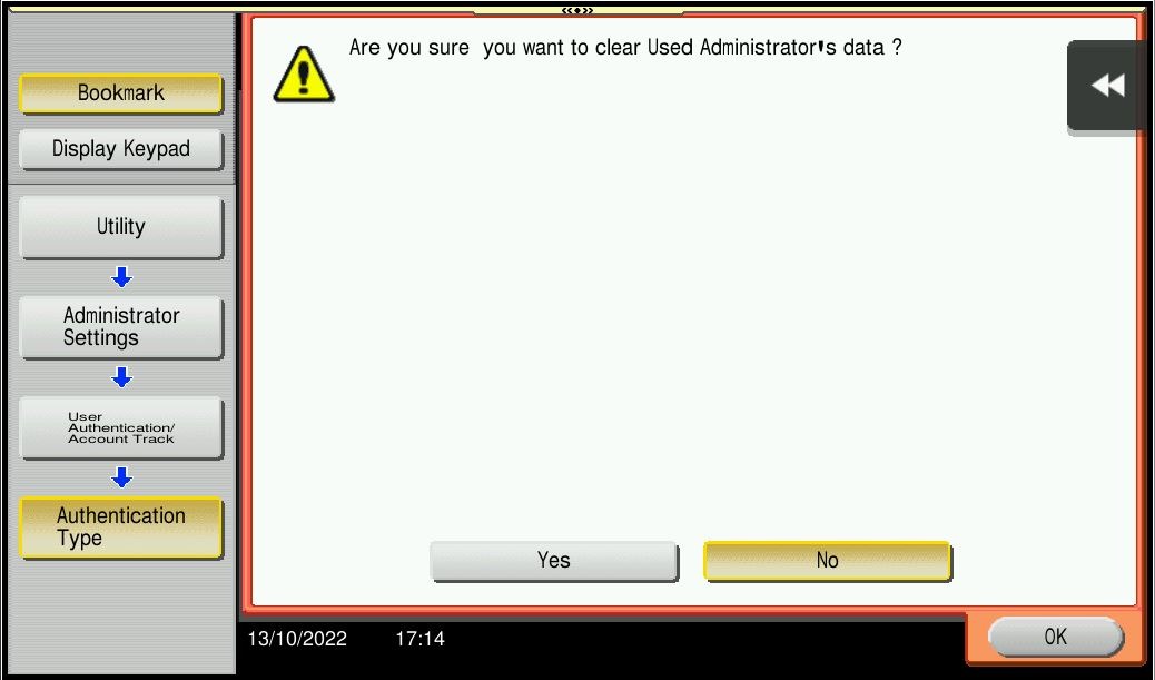 STEP 2: Click [OK] to Save the settings. A message will prompt “Are you sure you want to clear Used Administrator’s Data?”, select [Yes] and then click [OK].