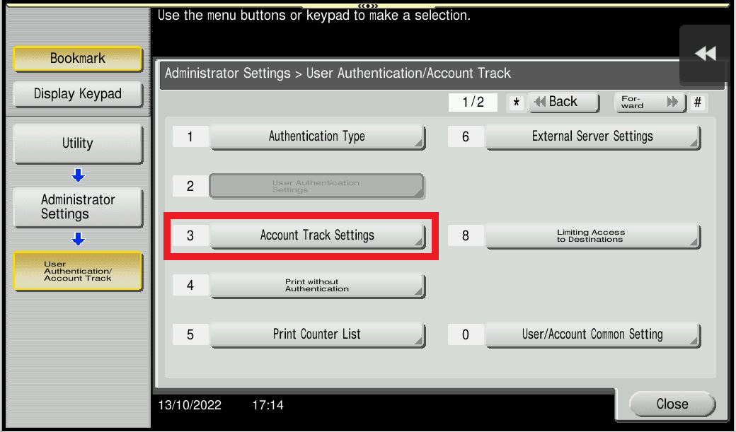 STEP 1: On the machine Control Panel, click [Menu] > [Utility] > [Administrator Settings] > [User Authentication/Account Track] > [General Settings] or [Authentication Type] > Turn ON Account Track and set the Account Track Input Method to [Account Name & Password] or [Password only].