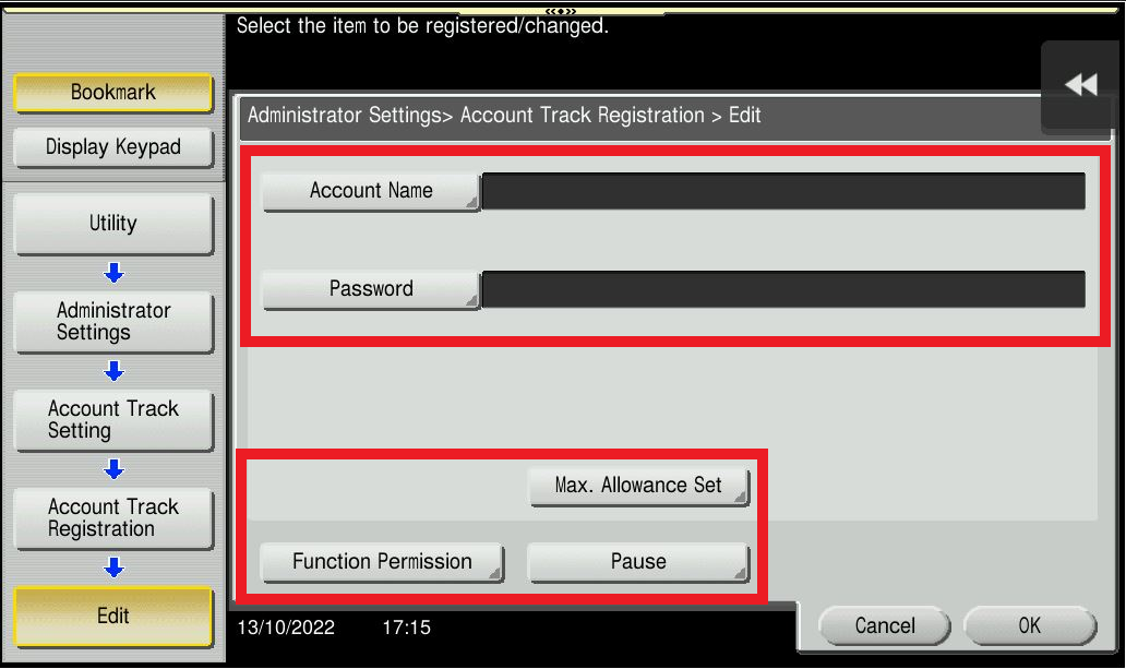 STEP 6: Enter the Account Name and Password for the new user. Select the [Function Permission] and [Allowance Set] at the bottom to set the needed functions for the user if needed. Click [OK] to save and exit. Click [Close] until the Main Menu.