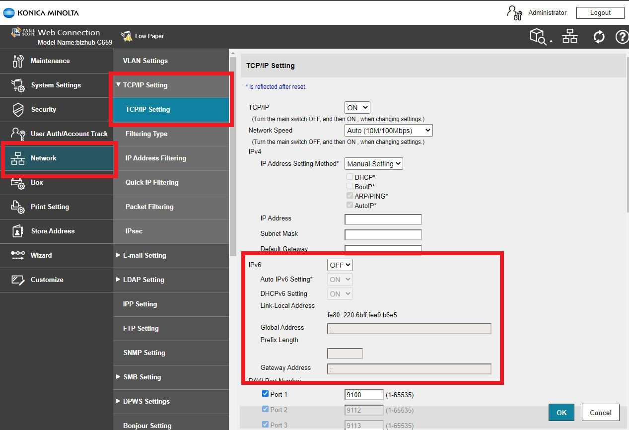 STEP 2 – Login as Administrator and go to [Network] > [TCP/IP Setting] and select [TCP/IP Setting].