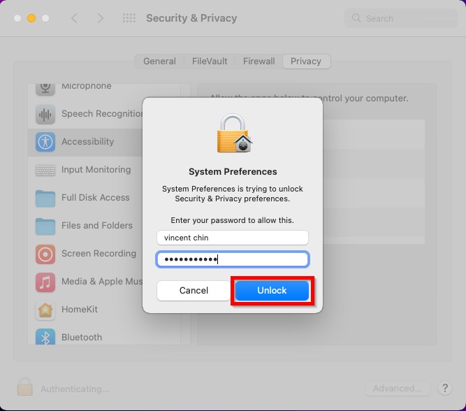 Step 4 – Click on the [Lock] icon – key in the PC password and click on the [Unlock]. (If not in the list)