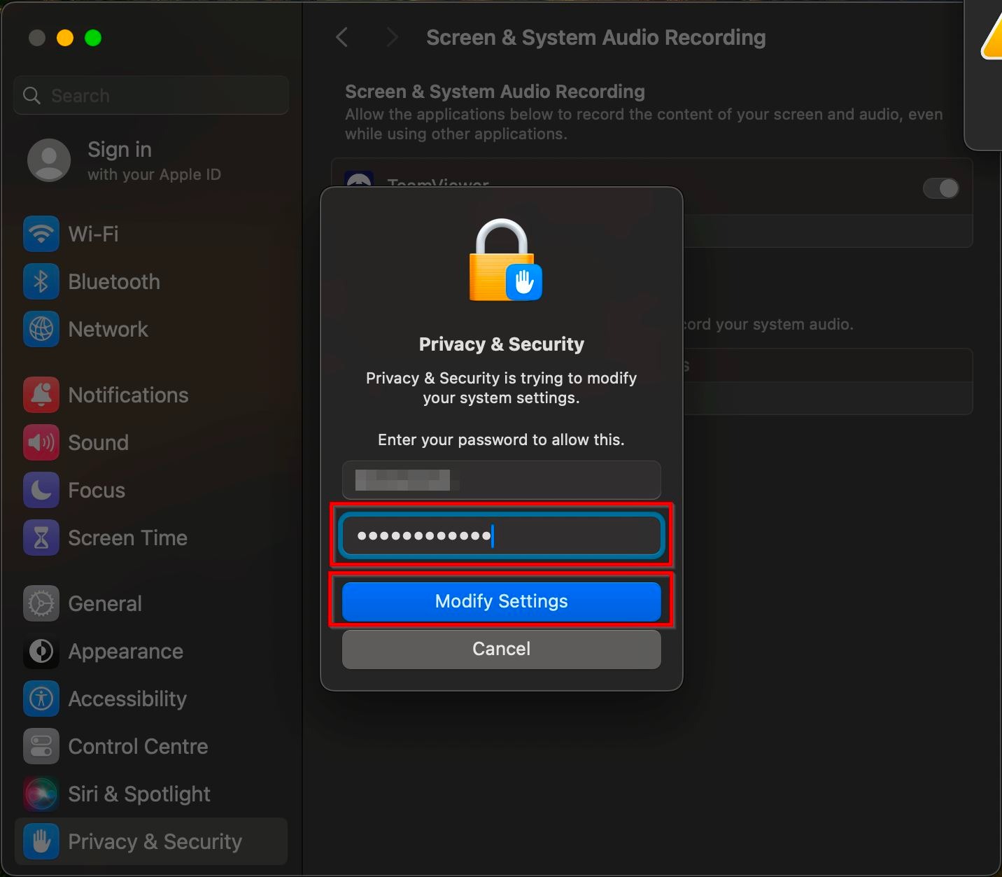 STEP 2 – Click on [Privacy & Security] and check is the TeamViewer is enable in the [Full Disk Access], [Accessibility] and [Screen & System Audio Recording].