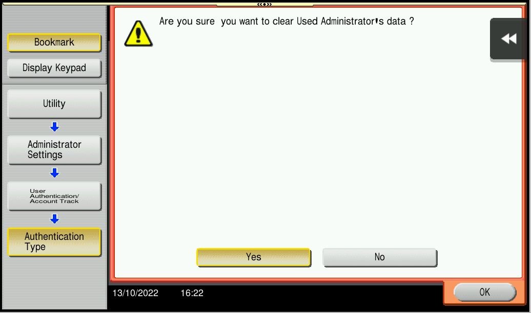 STEP 3 – Click [OK] to Save the settings. A message will prompt “Are you sure you want to clear Used Administrator’s Data?”, select [Yes] and then click [OK].