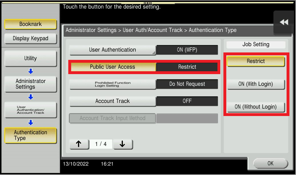 STEP 1 – On the machine Control Panel, click [Menu] > [Utility] > [Administrator Settings] > [User Authentication/Account Track] > [General Settings] or [Authentication Type] > and change the User Authentication to [Authenticate] then select [ON (MFP)].