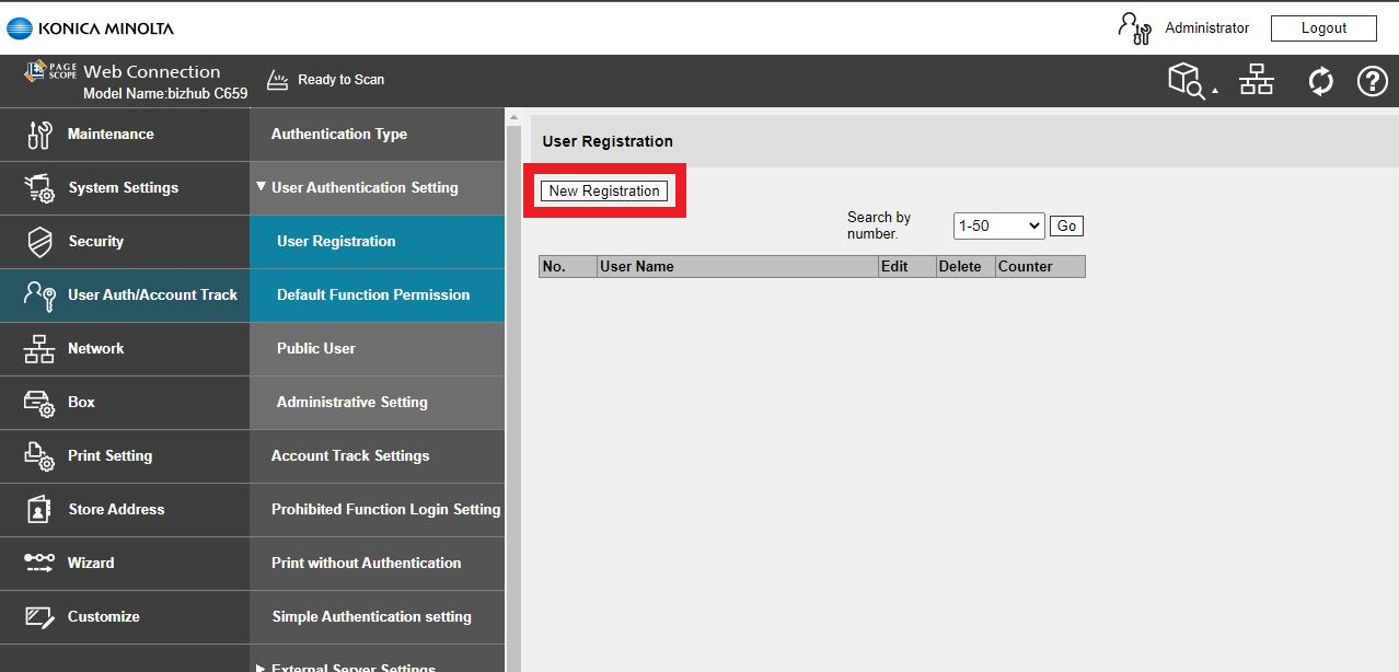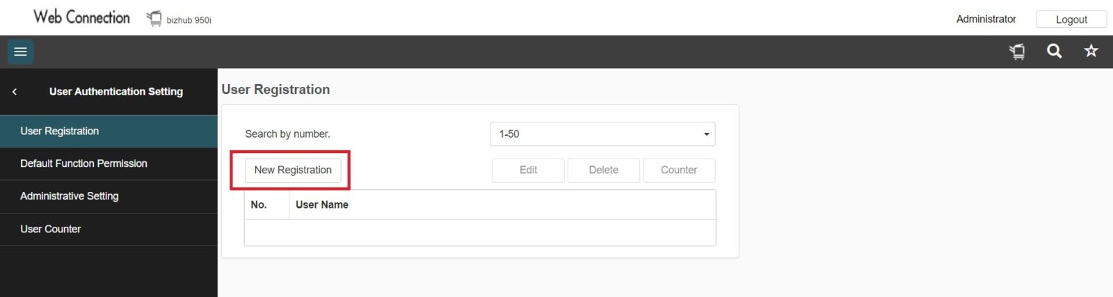 STEP 6 – Register a Username and Password, on the machine Administrator mode go to [User Auth/Account Track] > [User Authentication Settings] > [User Registration] > then click [New Registration] to register a new user.