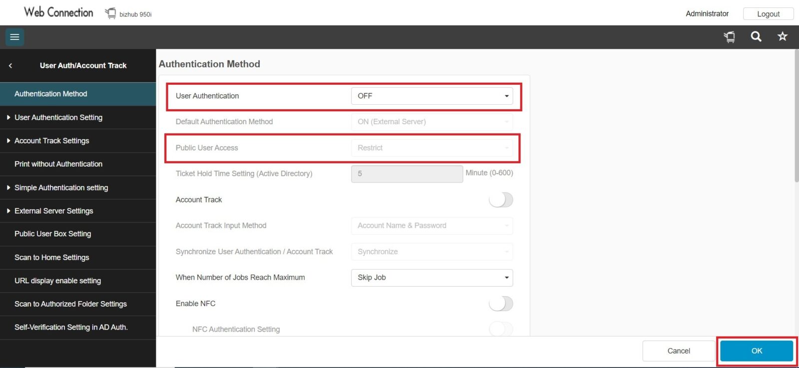 STEP 3 – Logout from public then login as Administrator and go to [User Auth/Account Track] > [Authentication Method] > Set the User Authentication to [ON (MFP)].