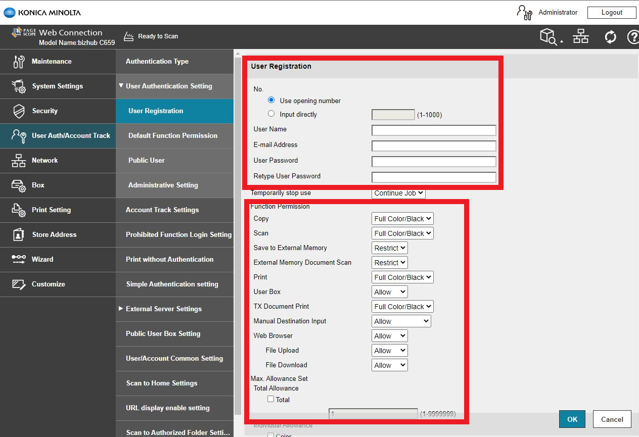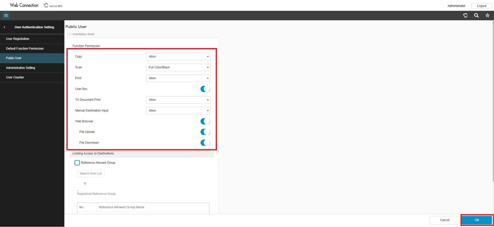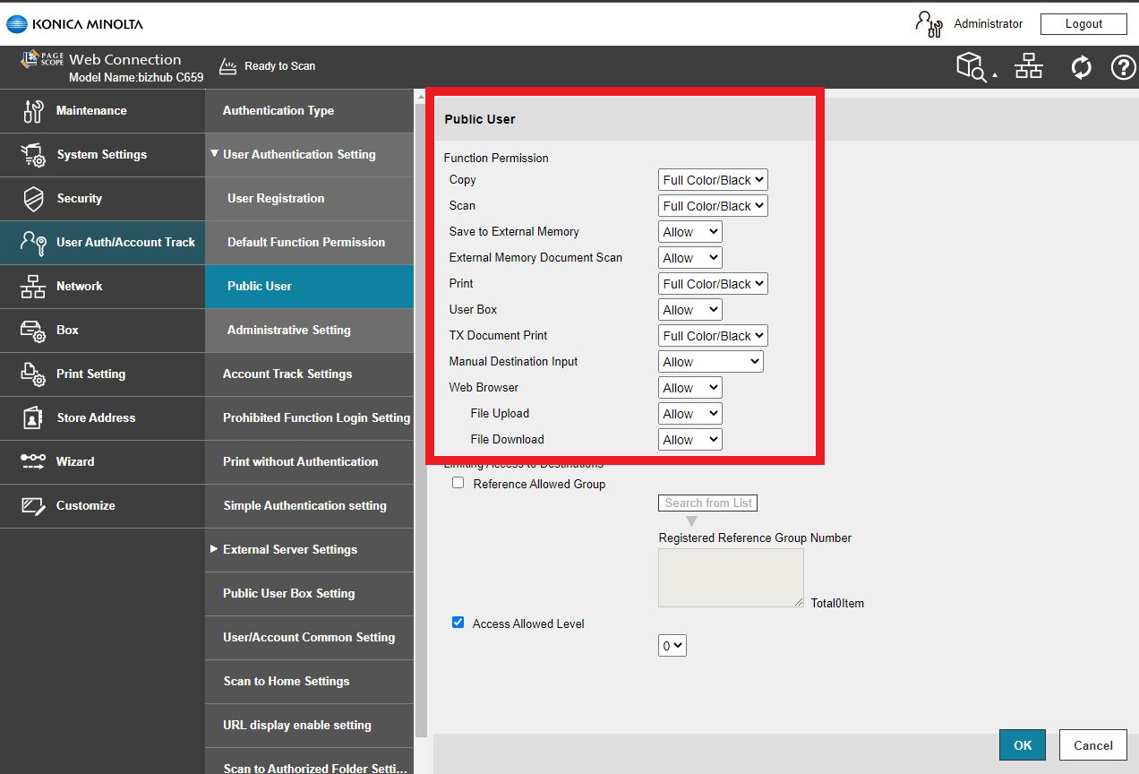 If Public User Access is set to ON, you can set the username/password and control the function permission by going to Administrator mode of the machine go to [User Auth/Account Track] > [User Authentication Settings] > then select [Public User].