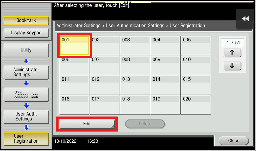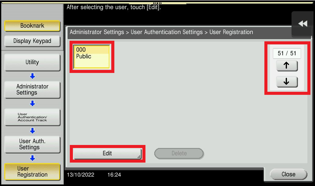 STEP 7 – (Optional) If you are using Public User Access, click the UP Arrow to go to page 51/51 and the Public registration will be visible. Select the [Public] box and click on [Edit] to set the username and password (if you choose ON (With Login)) or set the [Function Permission/Authority] for public use. This is where to set the Public access to Black/White only for Copy and Print if needed. Click [Close] until the Main Menu.