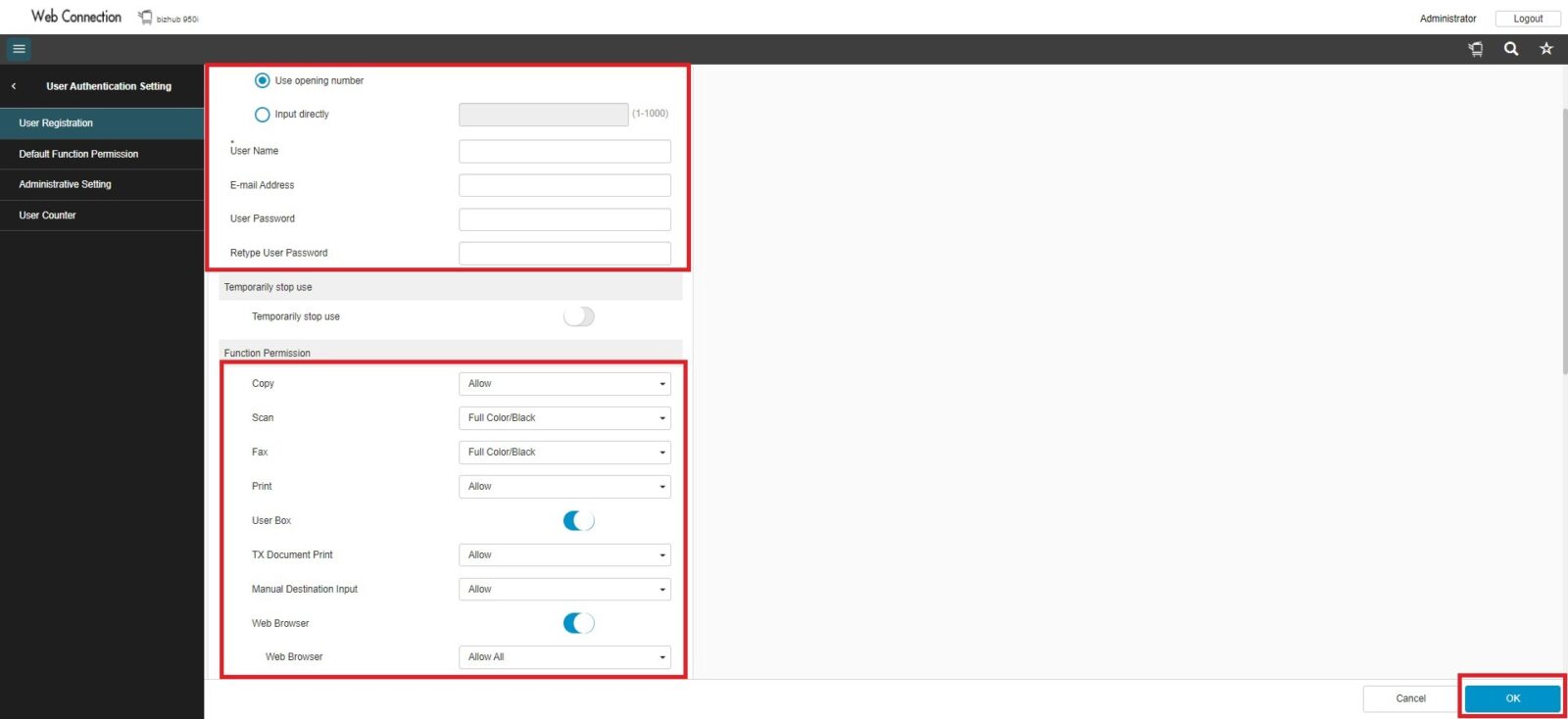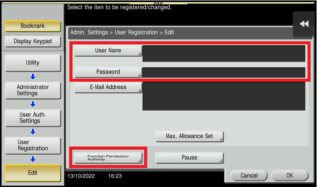 STEP 6 – Enter the Username and Password for the new user. No need to enter the E-mail Address. Then select the [Function Permission/Authority] at the bottom to set the needed functions for the user. Click [OK] to save and exit. Click [Close] until the Main Menu.