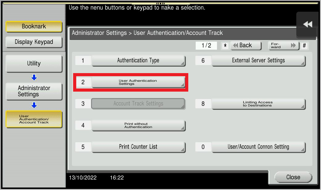 STEP 4 – Once enabled, go to [Menu] > [Utility] > [Administrator Settings] > [User Authentication/Account Track] > then go to [User Authentication] as this option will be available already.