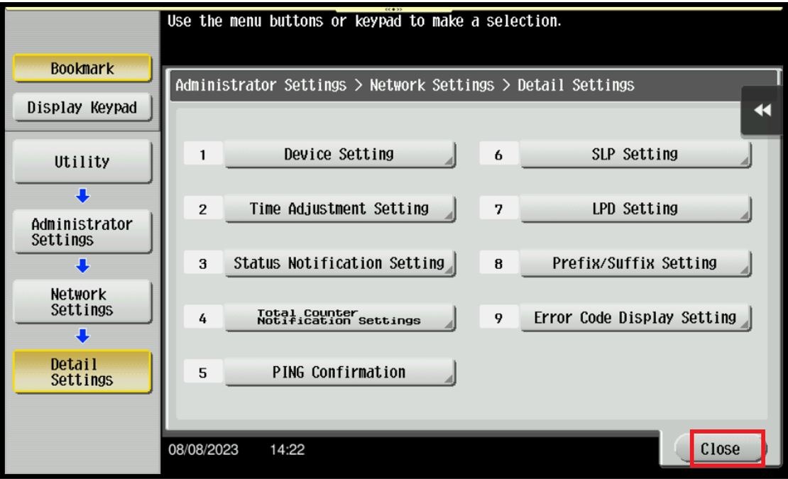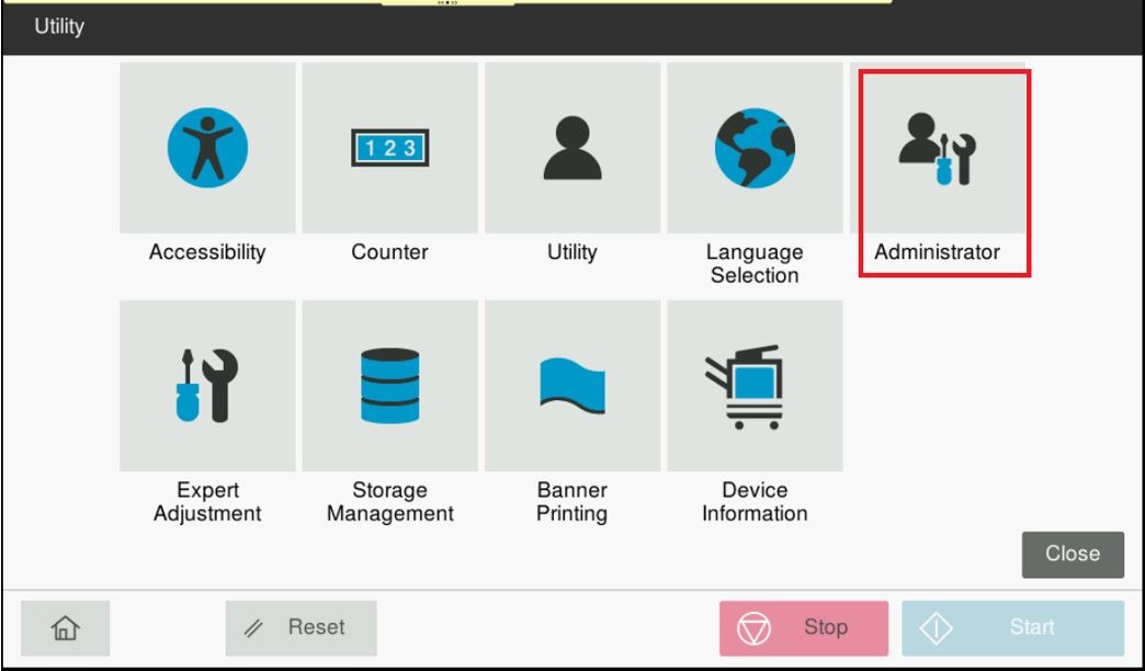 STEP 7 – Once the settings have been set, select the [Close] button to exit from the Administrator Mode.