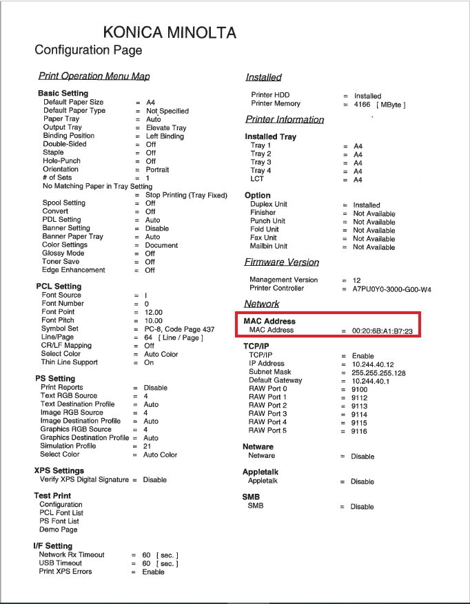 STEP 8 – Alternatively, you may find the MAC Address by printing the Configuration Page on Machine. Click Here for the guide on how to print the Configuration Page on machine. The example of MAC Address will be shown as below on the Configuration Page.