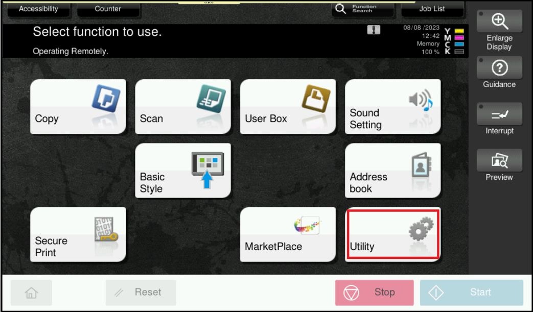 STEP 1 – On the Konica Minolta machine, click on [Menu] button, Select [Utility] from Control Panel.