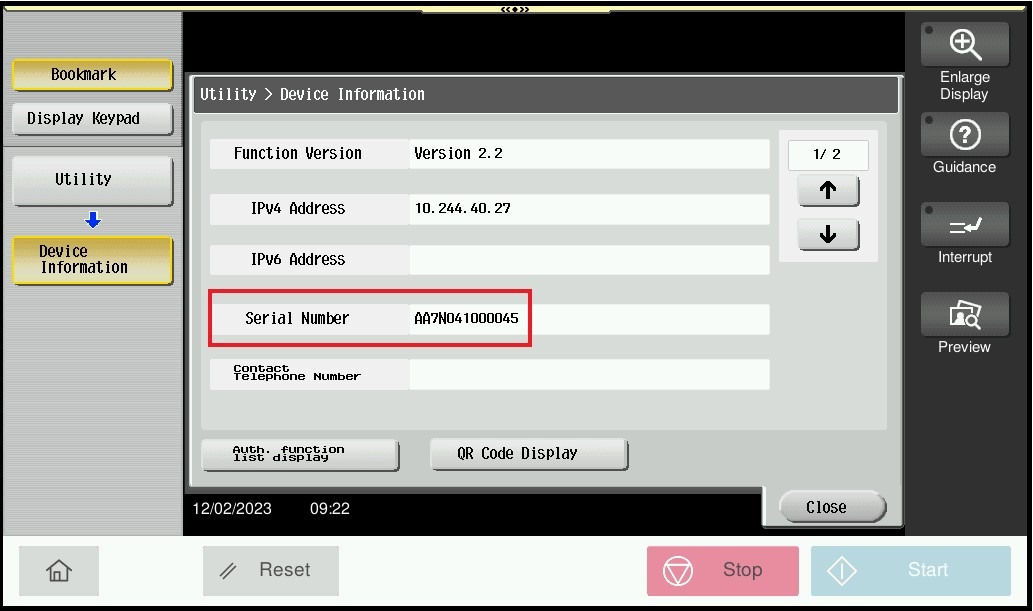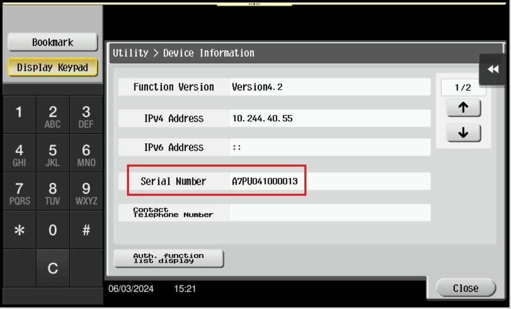 Guide on how to get the Serial Number from the Konica Minolta machine.