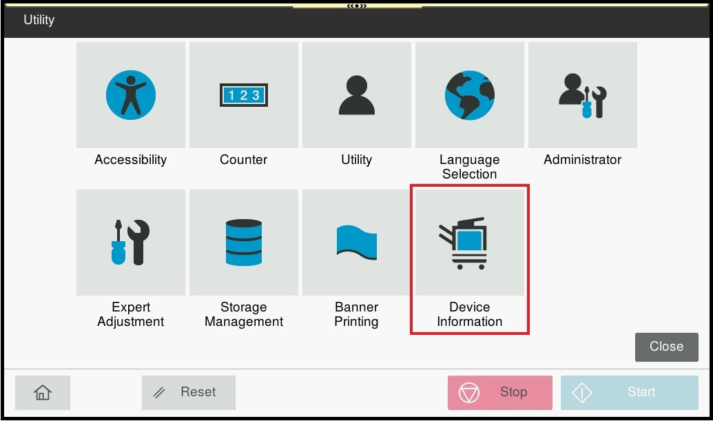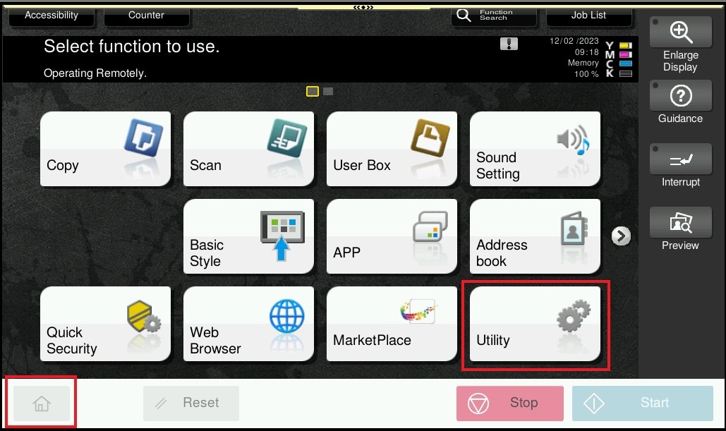 STEP 1 – On the Konica Minolta machine control panel, click on the [Home] button then select [Utility].