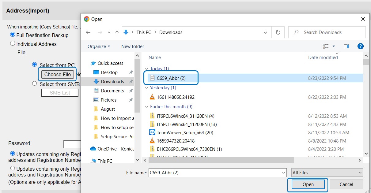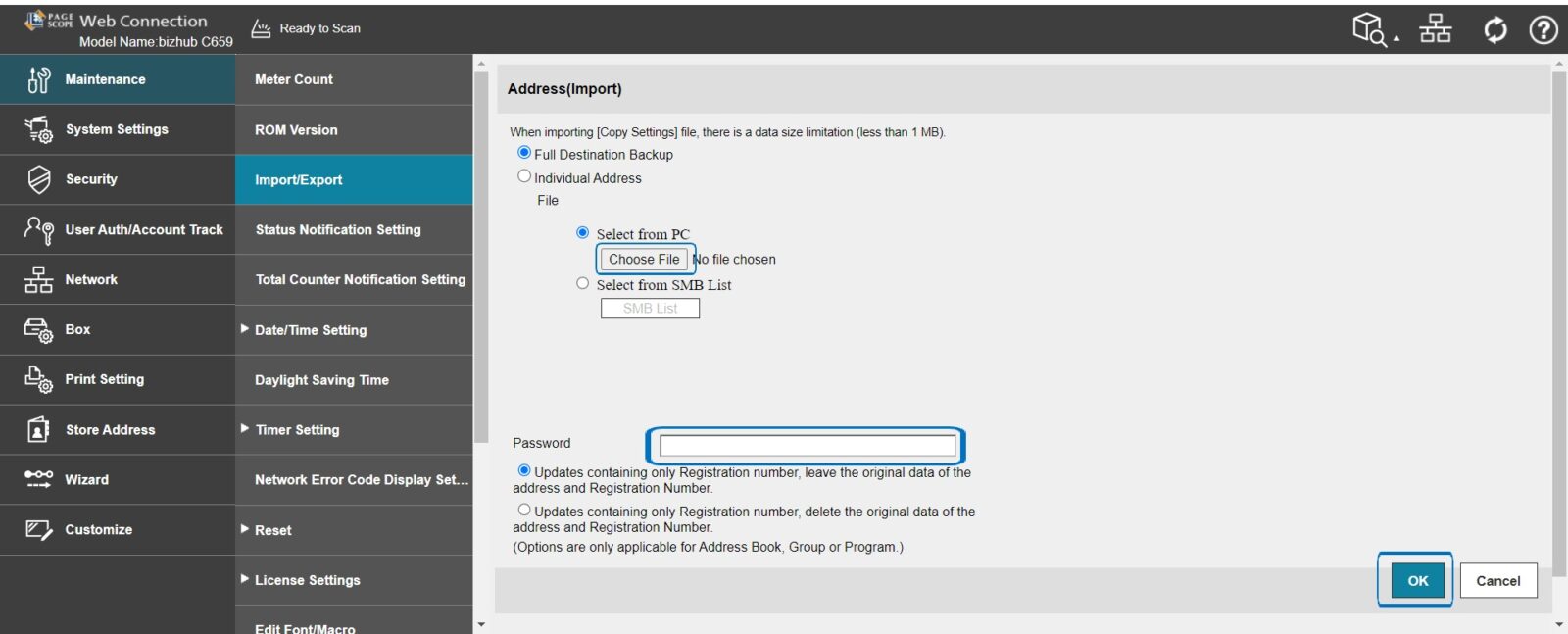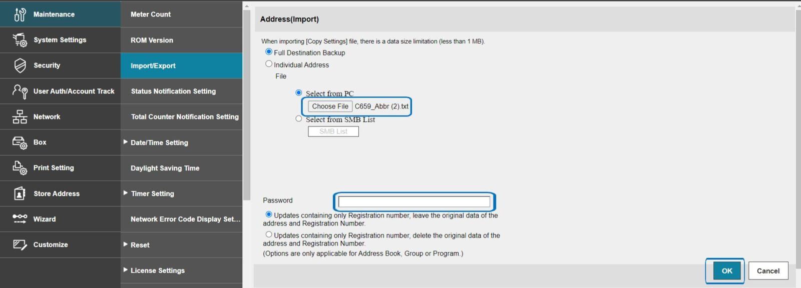 STEP 5 – Select [Choose File] to select backup file from PC, leave blank for Password, and select either leave the original data or delete the original data once imported. Next click on OK to start backup the address book to Machine.