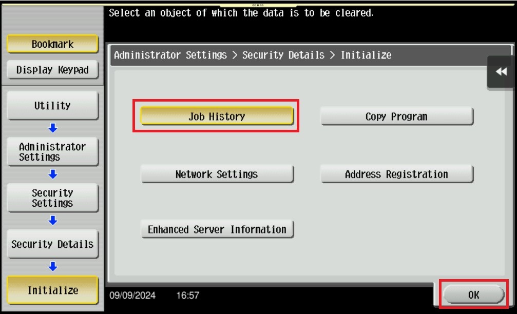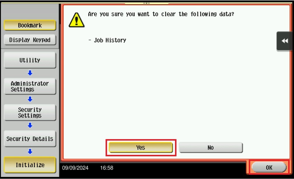 STEP 9 – Select [Yes], and click [OK] to initialize Job History. A message will prompt to restart the machine, please make sure to turn OFF the main power and wait for 20 seconds to turn it back ON.