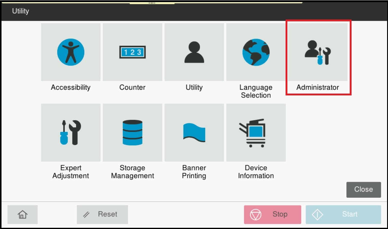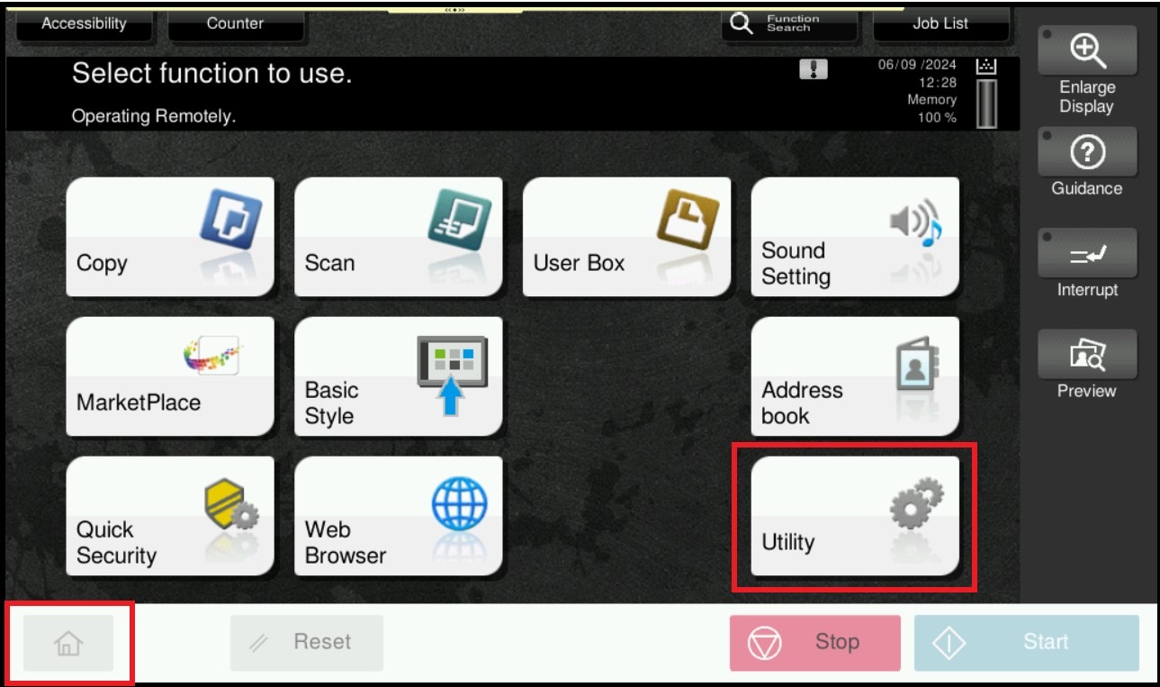 STEP 1 – On the Konica Minolta machine control panel, click on the [Home] button then select [Utility].