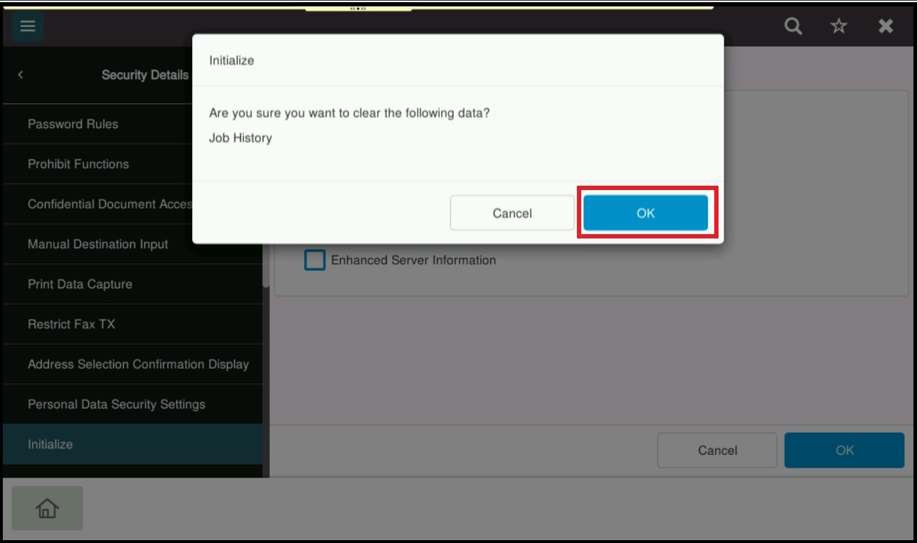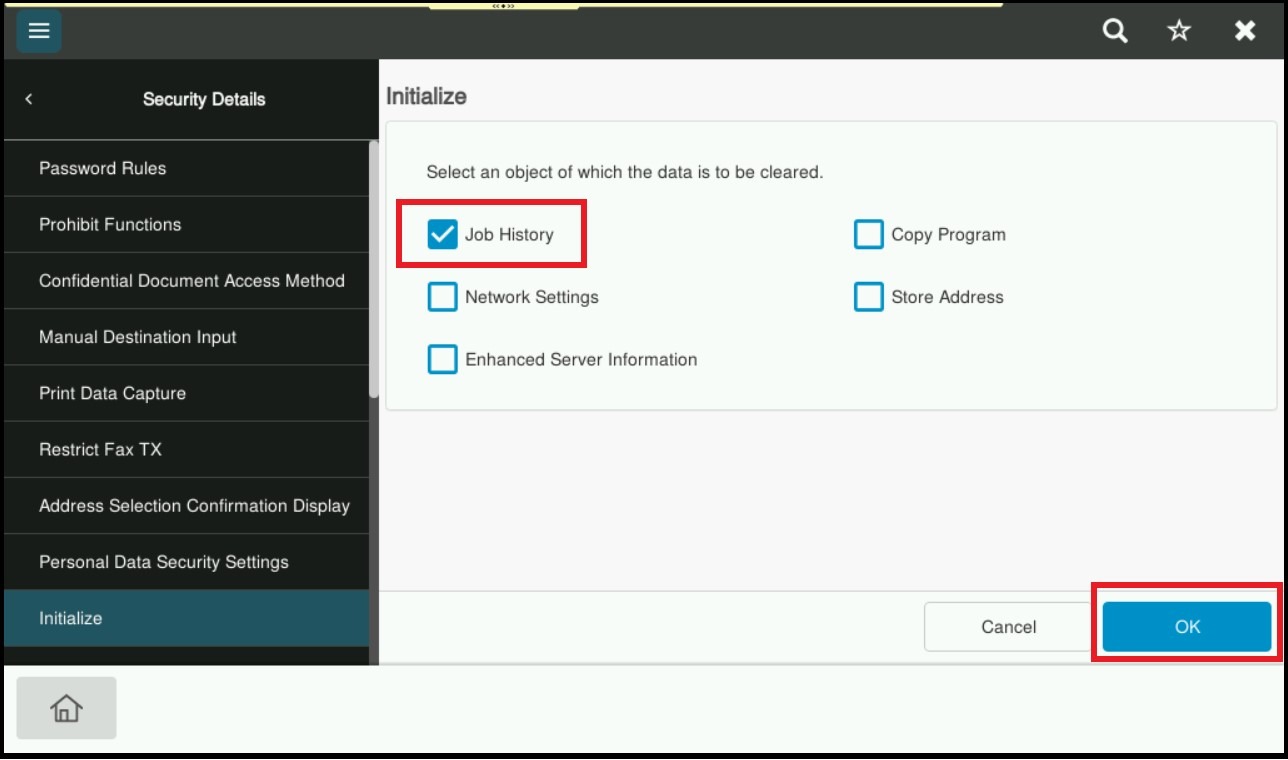 STEP 8 – Click [OK] to initialize Job History. A message will prompt to restart the machine, please make sure to turn OFF the main power and wait for 20 seconds to turn it back ON.
