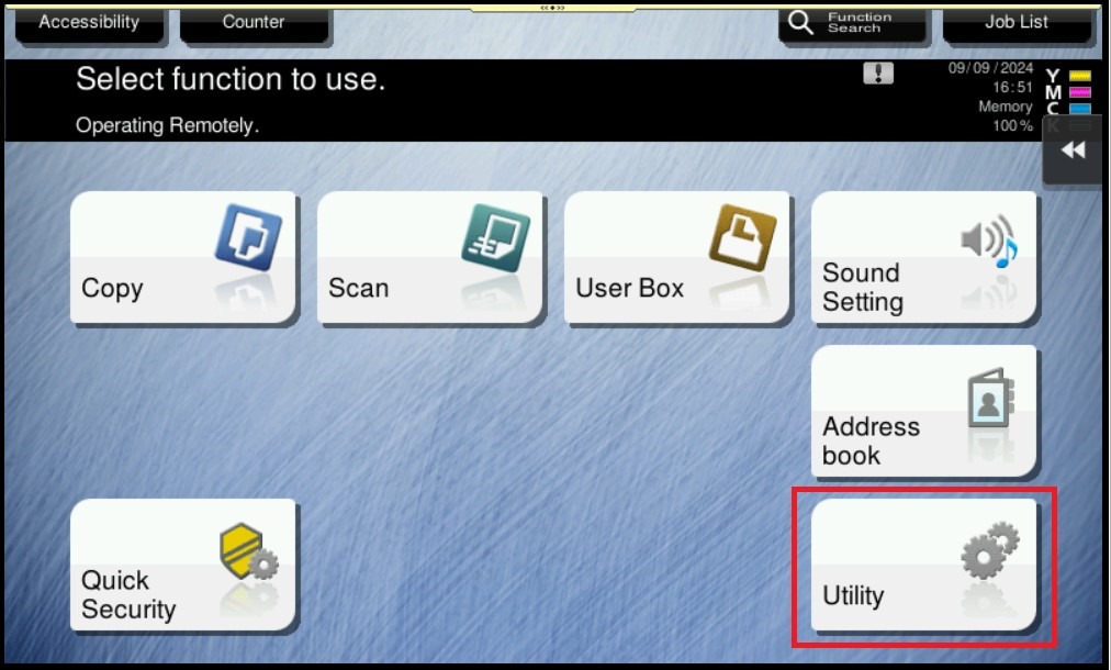 STEP 1 – On the Konica Minolta machine control panel, click on the [Menu] button then select [Utility].