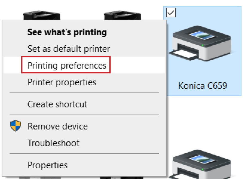 STEP 2– Right click on the Universal Konica Minolta printer and select Printing Preferences.