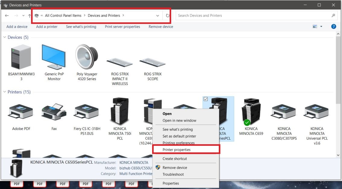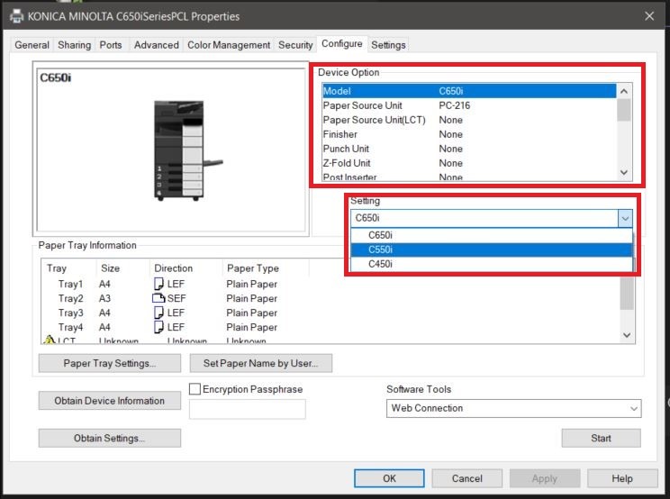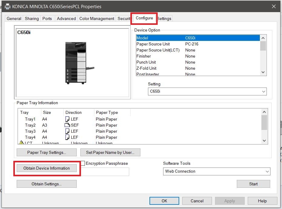 Guide on how to obtain the MFP device information on the Printer Driver. This will help to update the Device Option on the printer driver depending on what hardware or settings are turned ON for your Konica Minolta machine.