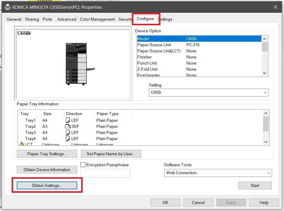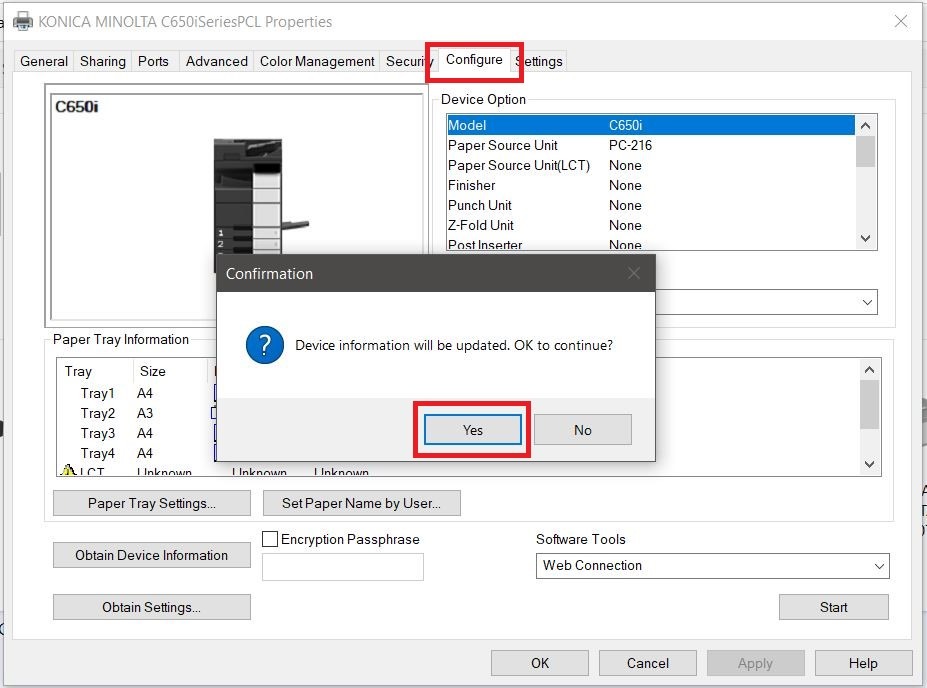 STEP 2 – Go to [Configure] tab, click on the [Obtain Device Information] at the lower left side of the window and select [Yes]. This should update the Device Option list at the upper right side of the window.
