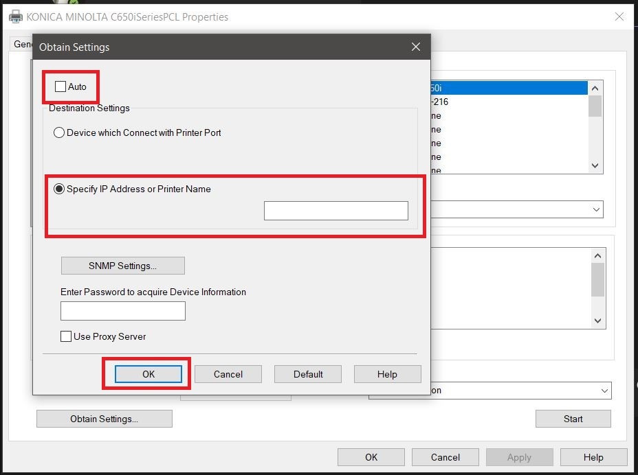 Notes: You can also manually obtain the settings by click on the [Obtain Settings] option at the lower left side of the window. On the pop-up window, un-tick the checkbox under [Auto], select [Specify IP Address or Printer Name] and enter the machine IP address. Click OK and follow the STEP 2.