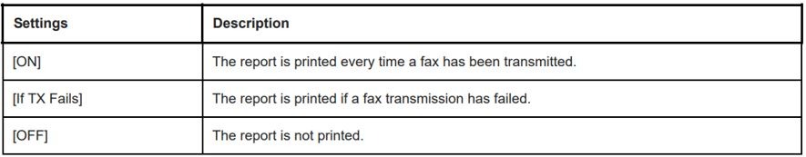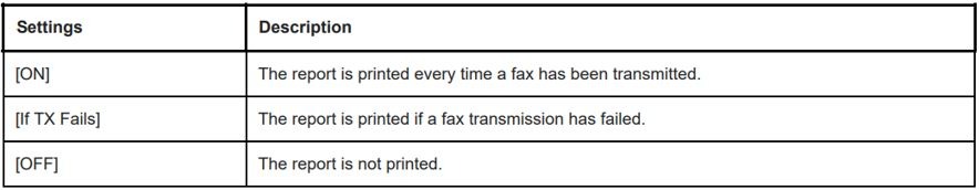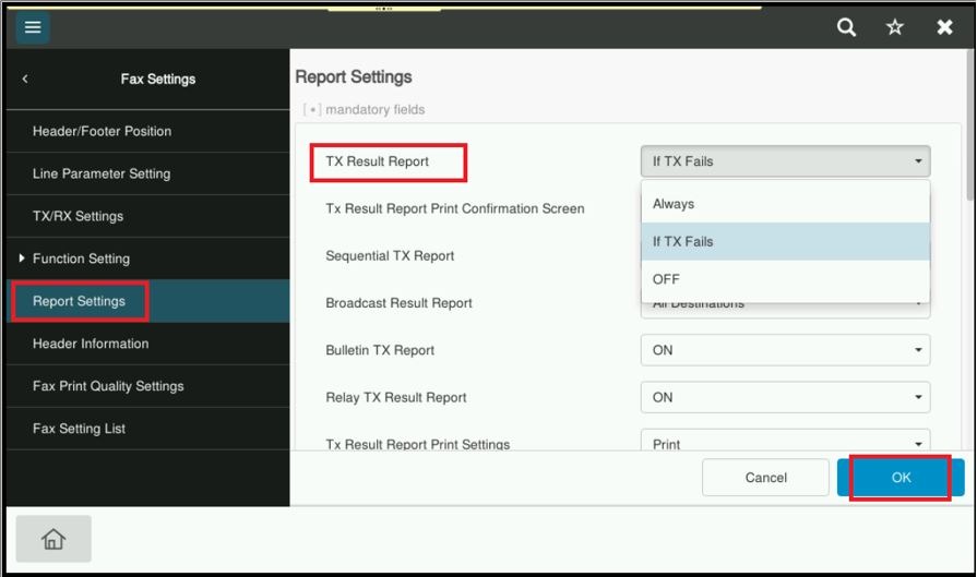 STEP 6 – Press [TX Result Report] and specify when to print a report containing the result of fax transmission. [If TX Fails] is specified by default, which mean the report is automatically printed when a transmission failure occurs. Click [OK] to save the setting once the selection of when to print a report has been made.