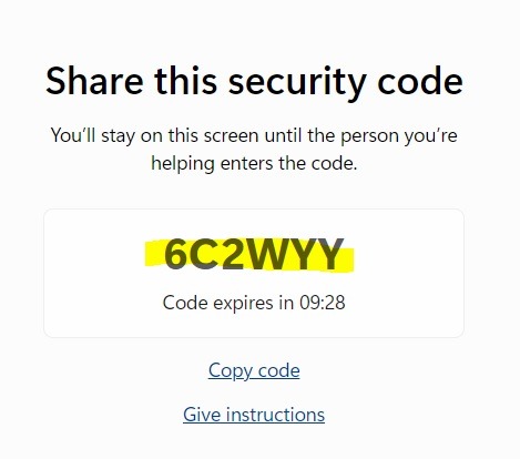 STEP 4 – The Support will be able to obtain one Security Code which last for 10 min, kindly provide the code to the user who need the support to be key in under Get Help section.
